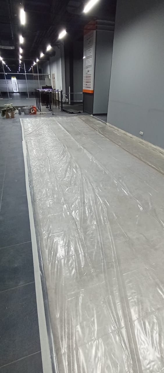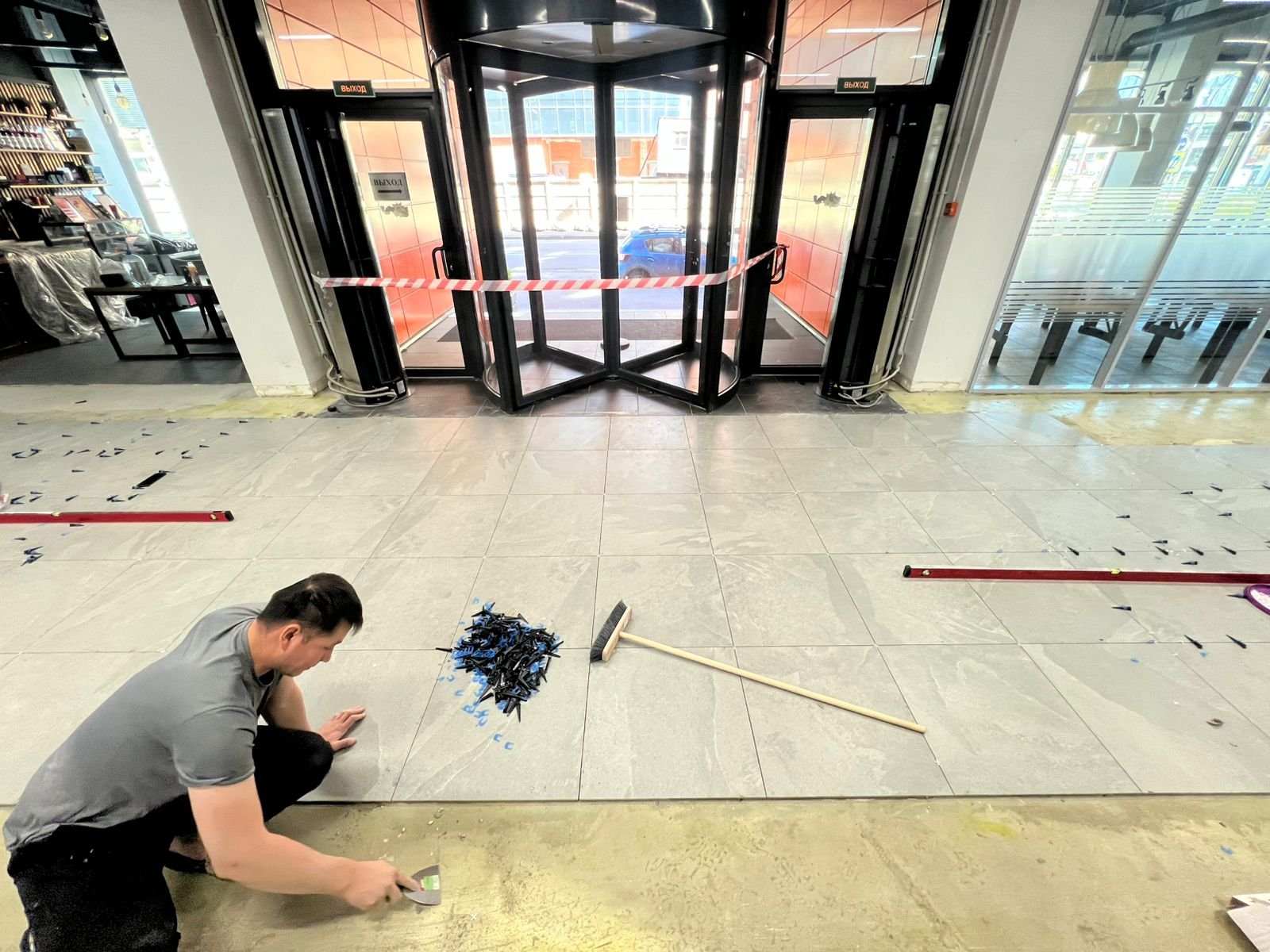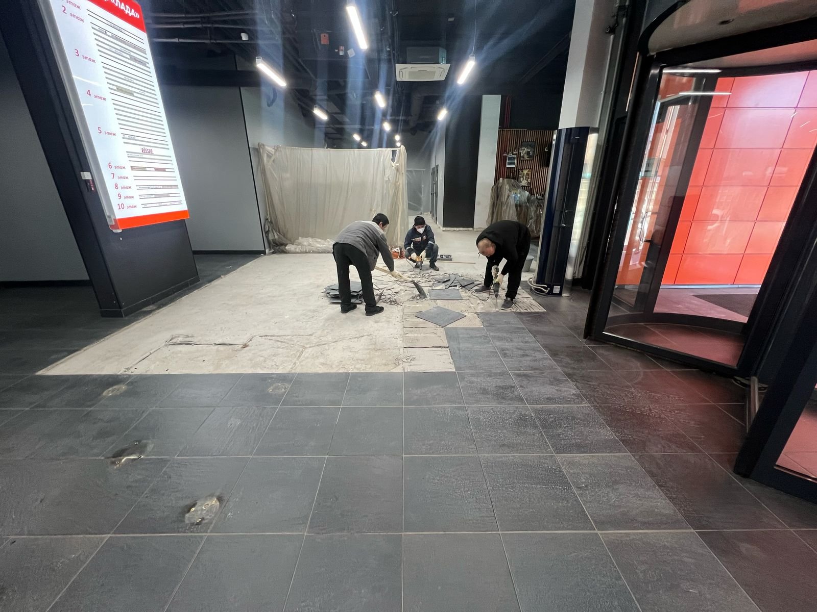 В начале 2025 года мы провели реконструкцию входной группы в бизнесс центре лада. Провели демонтаж керамогранита, демонтаж стажки и клея, прогрунтовали пол, залили самовыравнивающим составом, уложили новый керамогранит.
