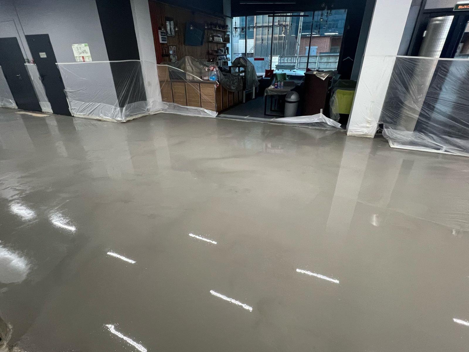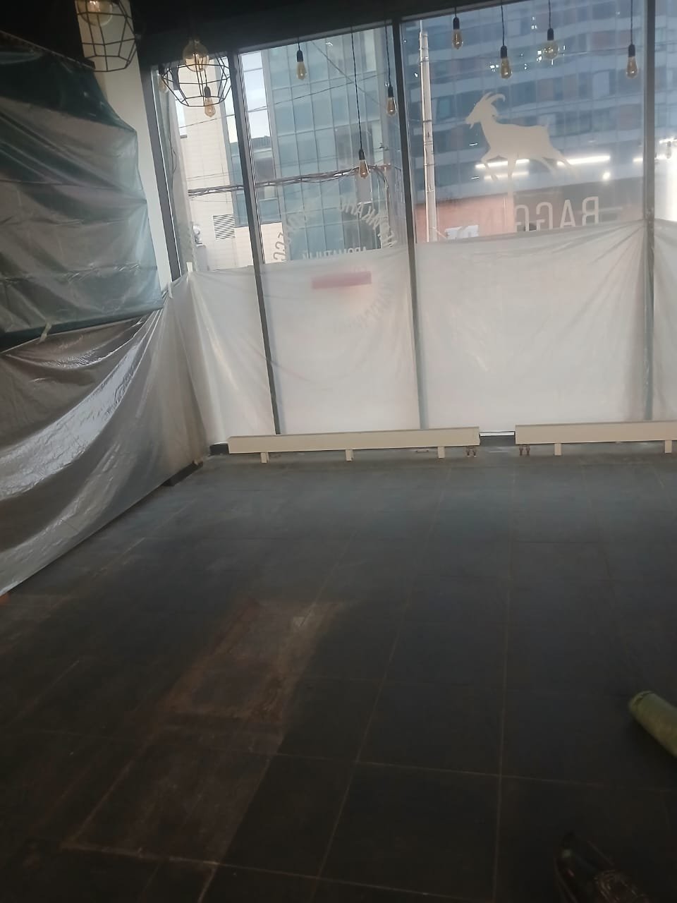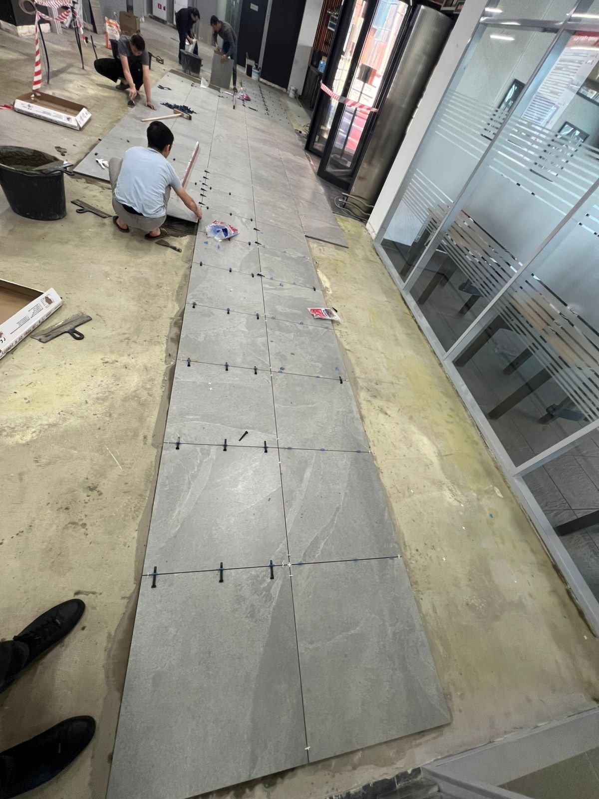 В начале 2025 года мы провели реконструкцию входной группы в бизнесс центре лада. Провели демонтаж керамогранита, демонтаж стажки и клея, прогрунтовали пол, залили самовыравнивающим составом, уложили новый керамогранит.