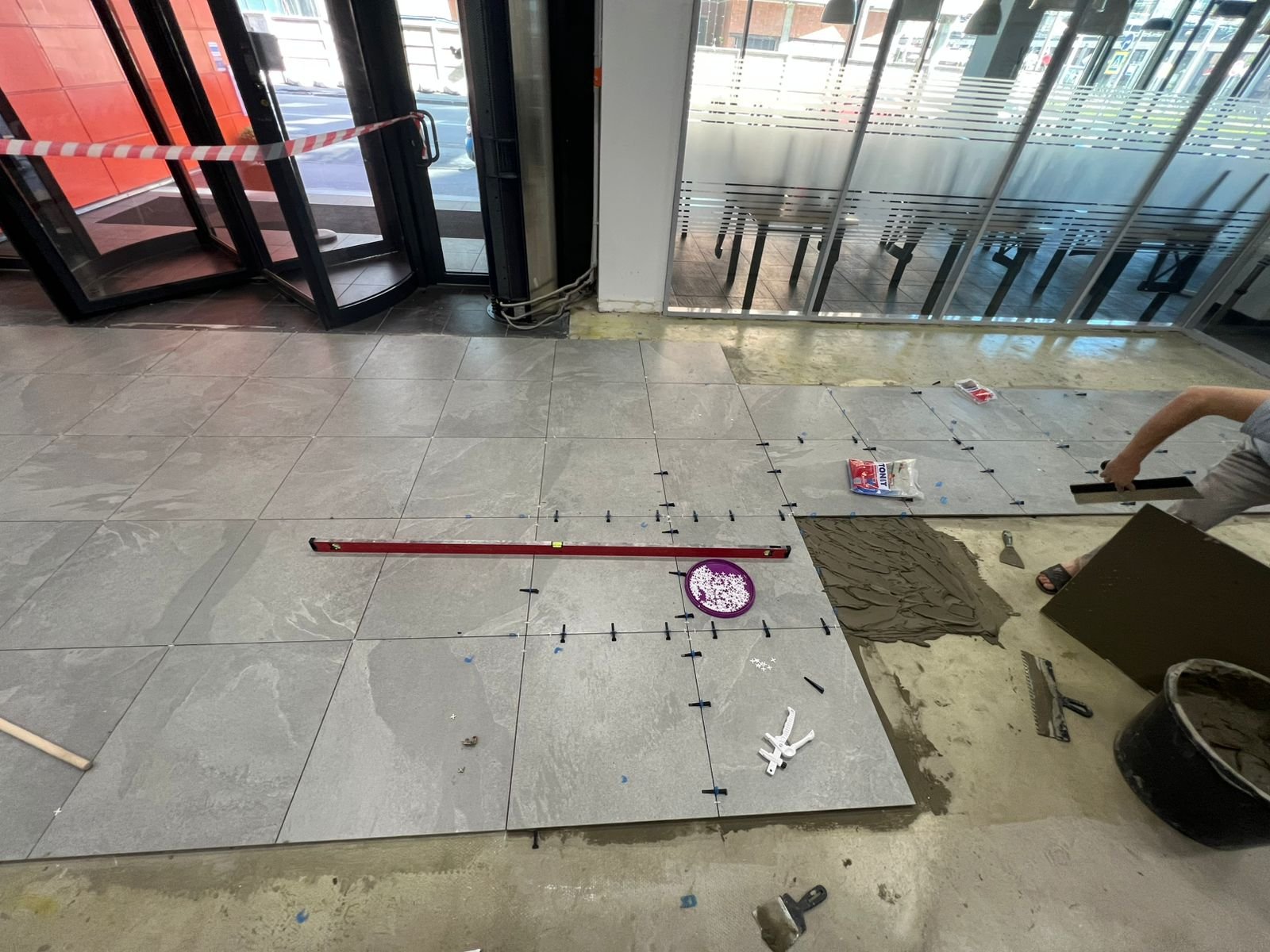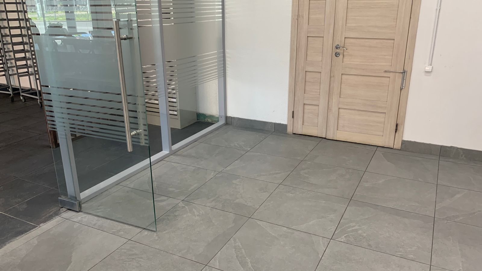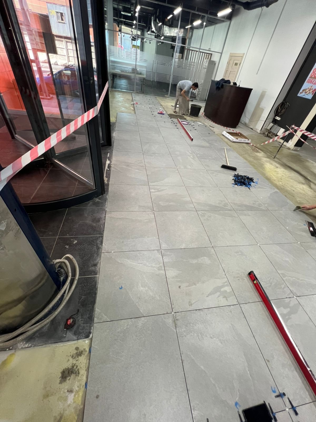 В начале 2025 года мы провели реконструкцию входной группы в бизнесс центре лада. Провели демонтаж керамогранита, демонтаж стажки и клея, прогрунтовали пол, залили самовыравнивающим составом, уложили новый керамогранит.