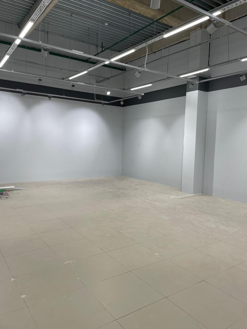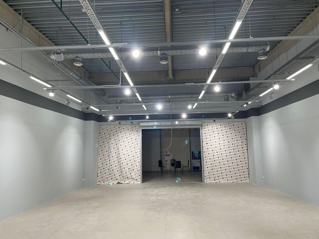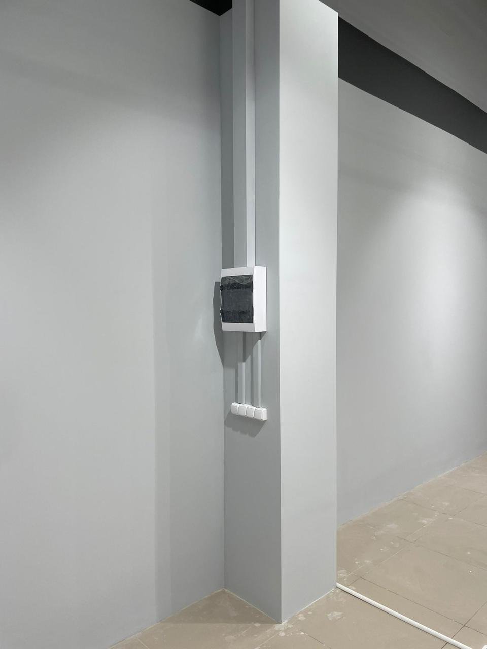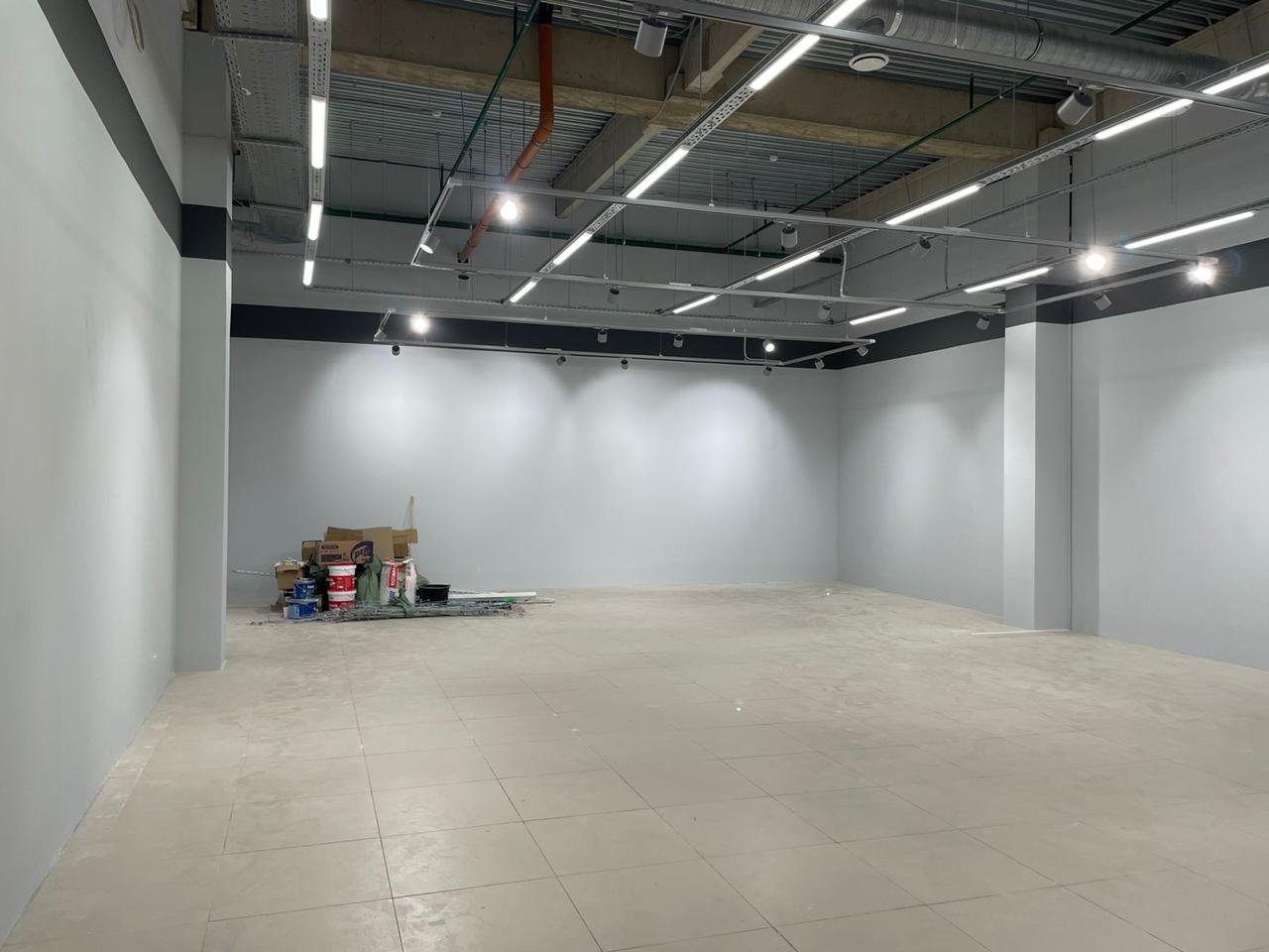 По техническому заданию было проведено новое освещение, кабельные сети, собран новый электрощит, проложены новые лотки по помещению. Был сделан ремонт стен: шпаклёвка, покраска, возведение некоторых перегородок и монтаж закладных внутрь стен для крепления торгового оборудования.